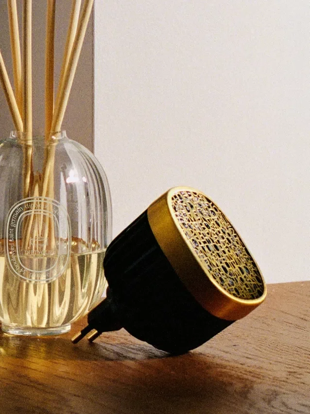 basta con pulsar para liberar el perfume. este difusor eléctrico utiliza el propio aire para difundir las notas de nueve fragancias icónicas de Diptyque.