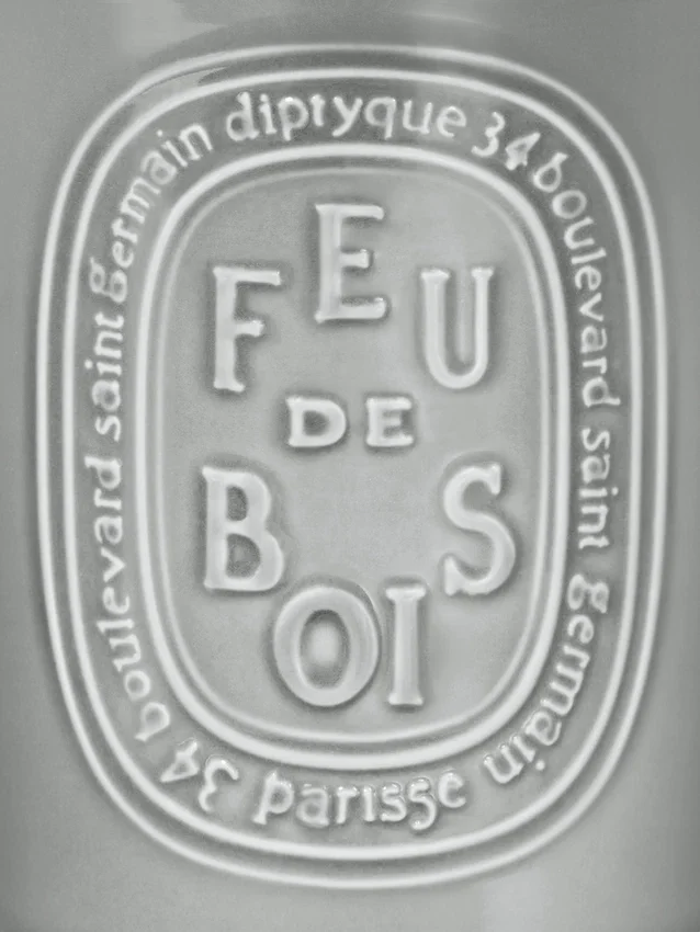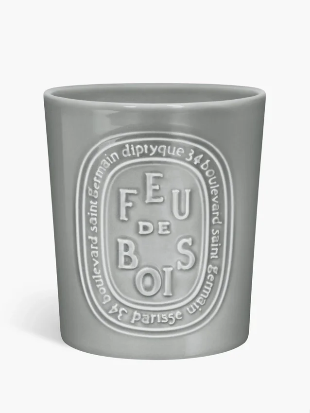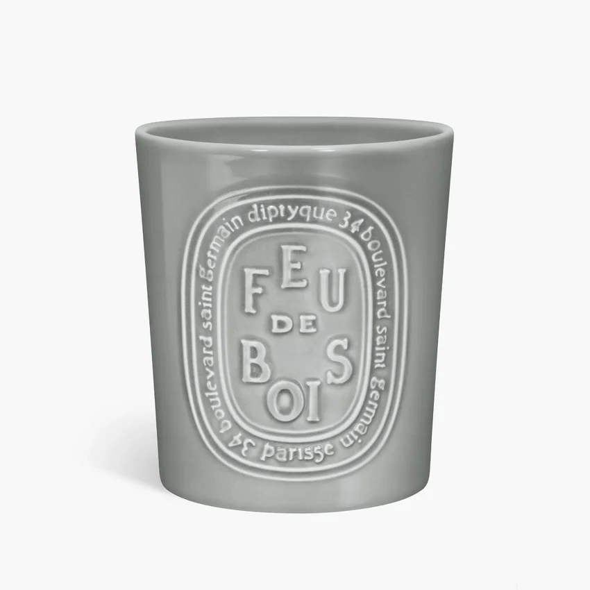 La vela Feu de Bois/Wood Fire se presenta en un tarro de porcelana esmaltada gris con el óvalo de Diptyque estampado. Esta fragancia icónica evoca el aroma de una chimenea encendida.