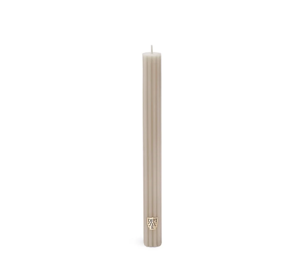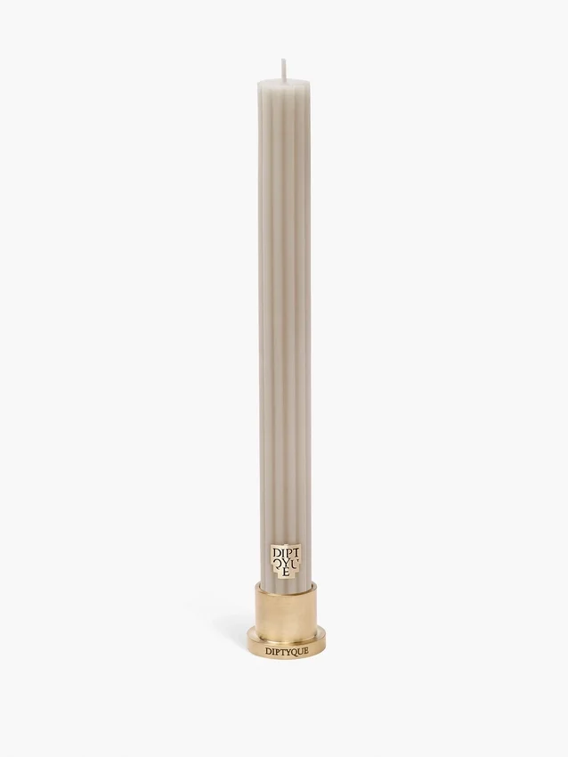 La vela cónica «Feu de Bois» (fuego de leña), una variación de Diptyque sobre la cera moldeada y perfumada, aporta un aire festivo a la mesa.